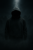 L’image doit être verticale (format mobile), fond sombre avec fumée réaliste, et au centre un hoodie noir en lévitation dans l’ombre, style mystérieux et cinématique.